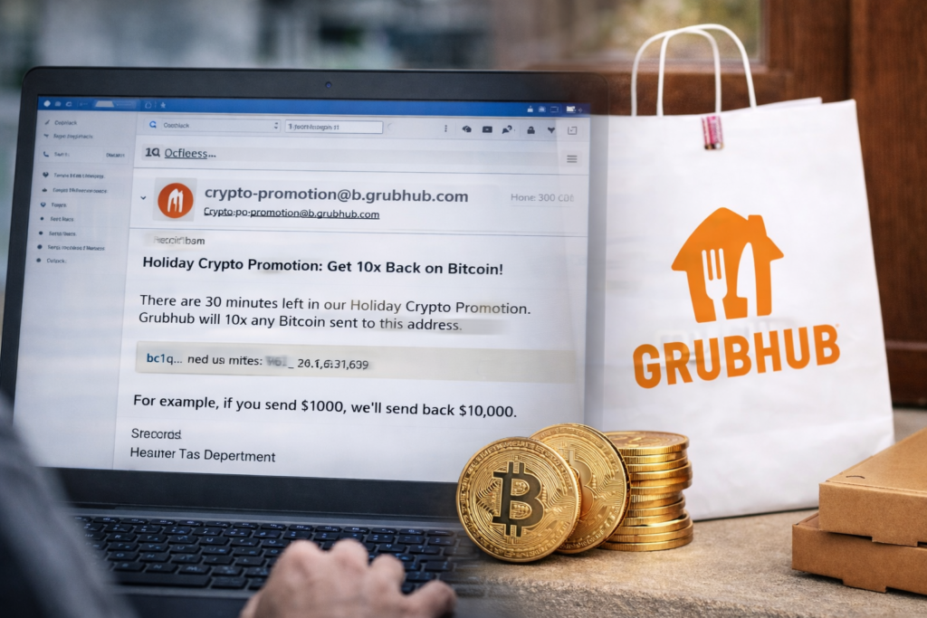 A new wave of phishing emails impersonating Grubhub has surfaced, tricking recipients with promises of massive cryptocurrency rewards. The fraudulent messages claim to offer a “Holiday Crypto Promotion,” encouraging users to send Bitcoin with the promise of receiving ten times the amount in return.